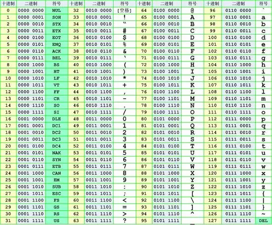ASCII编码大致可以分作三部分组成: