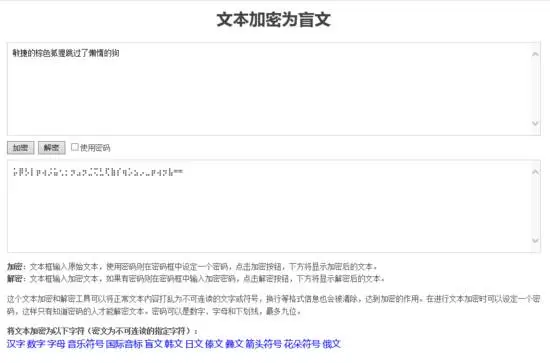文本加密可以将正常文本内容打乱为不可连读的文字或符号(汉字 数字 字母 音乐符号 国际音标 盲文 韩文 日文 傣文 彝文 箭头符号 花朵符号 俄文),换行等格式信息也会被清除,达到加密的作用。在进行文本加密时可以设定一个密码,这样只有知道密码的人才能解密文本。密码可以是数字、字母和下划线,最多九位。