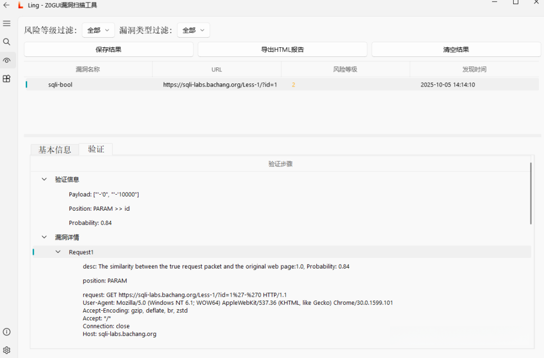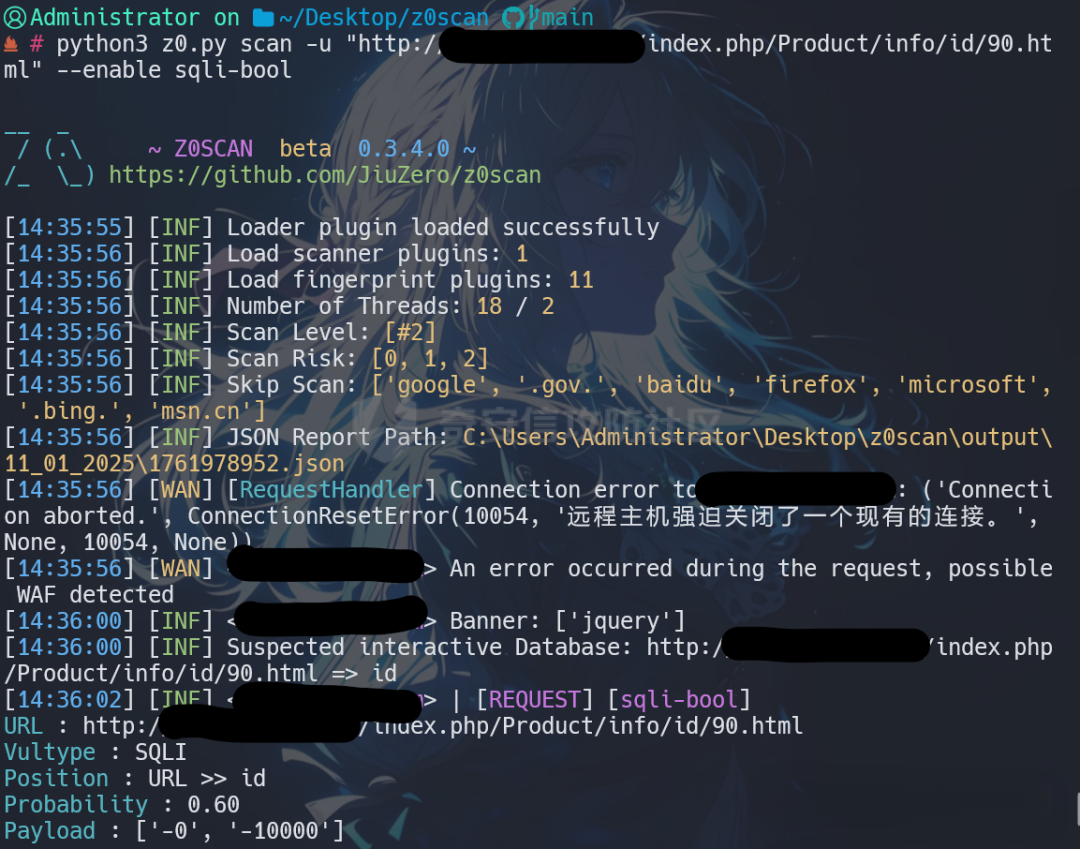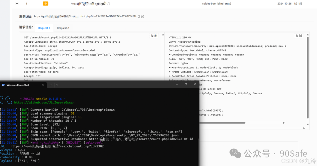 4.伪静态参数智能提取 针对 EZScanner、Xray 等工具尚未完善的伪静态路径解析能力,Z0Scan进行了初步实现,覆盖多种伪静态结构,尽可能减少漏报。 得益于WAF 指纹信息对插件的干涉,sqli-bool 采用了更保守、更少的Payload完成了检测: