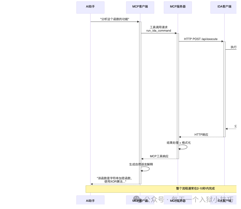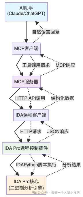 AI+MCP+IDA自动逆向分析:从入门到实战部署引言在逆向工程领域,自动化分析一直是提升效率的关键。随着大语言模型技术的快速发展,AI辅助逆向分析已成为行业新趋势。本文将深入介绍如何通过Model Context Protocol(MCP)协议将AI助手与IDA Pro无缝集成,实现智能化的二进制分析流程。 1. MCP协议详解:连接AI与IDA的桥梁1.1 什么是MCP协议Model Context Protocol(MCP)是一个开放的标准协议,专门设计用于AI助手与各种应用程序和工具之间的交互。它采用客户端-服务器架构,允许大语言模型通过标准化接口调用外部工具的功能。 可以将MCP协议理解为一个智能中介层,它定义了标准化的接口规范,使AI助手能够与外部工具进行交互。在实际运行过程中,AI助手通过MCP协议告知其需要执行的操作,MCP协议负责将这些请求转换为目标工具可理解的指令,执行相应功能后再将结果返回给AI助手,从而实现AI与专业工具之间的无缝协作。