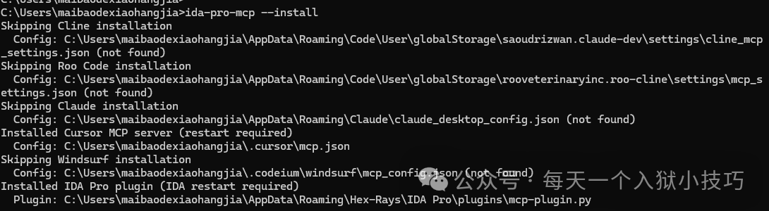 配置 MCP 服务器并安装 IDA 插件: ida-pro-mcp --install
