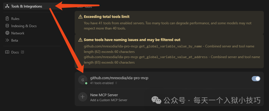 4. 本地部署打开cursor验证MCP服务器(不一定cursor,只要支持MCP的AI终端编辑器都可以)因为上面已经使用ida-pro-mcp --install配置了默认cursor的默认mcp配置,所以这里直接打开就有mcp服务器配置