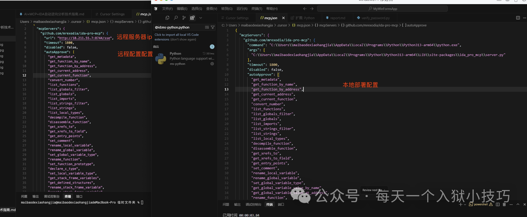 现在配置需要连接远程IDA-MCP插件的客户端机器,这里也是用cursor进行演示。编辑mcp配置