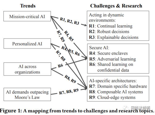这一部分讨论如何利用系统、安全、体系结构领域的创新成果来解决之前提出的若干挑战和问题。我们总结了9个研究方向,可以分类为三大主题,包括:动态环境下的处理技术、安全的人工智能、人工智能定制的体系结构。下图总结了人工智能的4大趋势和9大研究方向的关联关系。