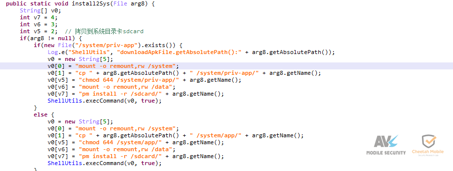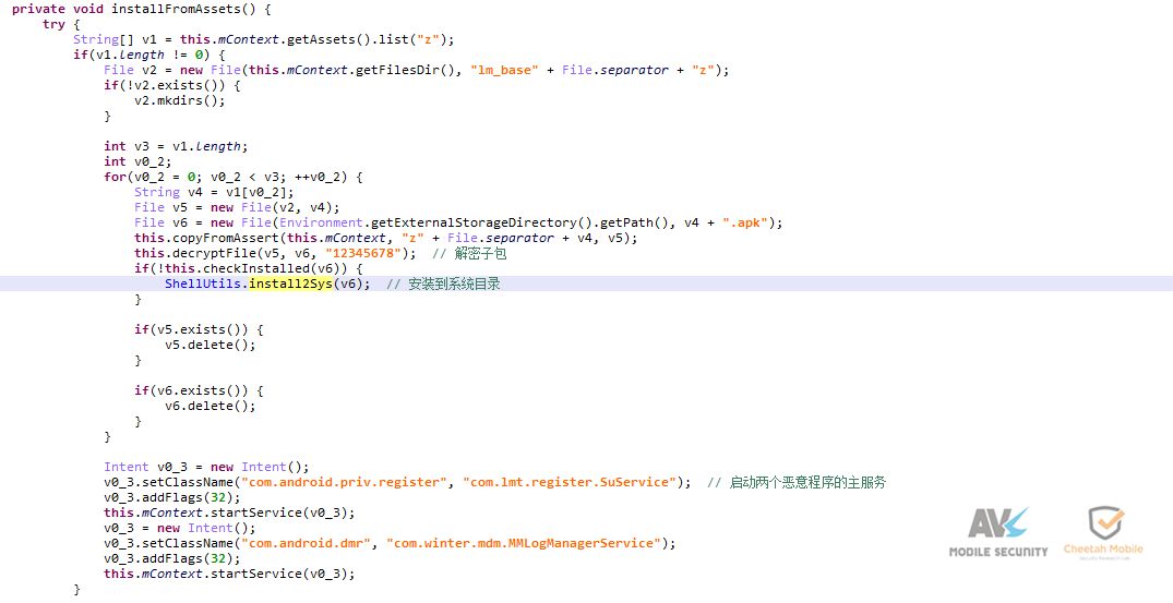 该恶意应用被下载安装后将隐藏图标,下载提权相关文件、私自提权,解密静默安装恶意程序到系统目录,修改多个系统api调用的返回值,联网获取数据模拟点击注册google账号,还会私自下载恶意子包,上传用户账号、固件等信息。
