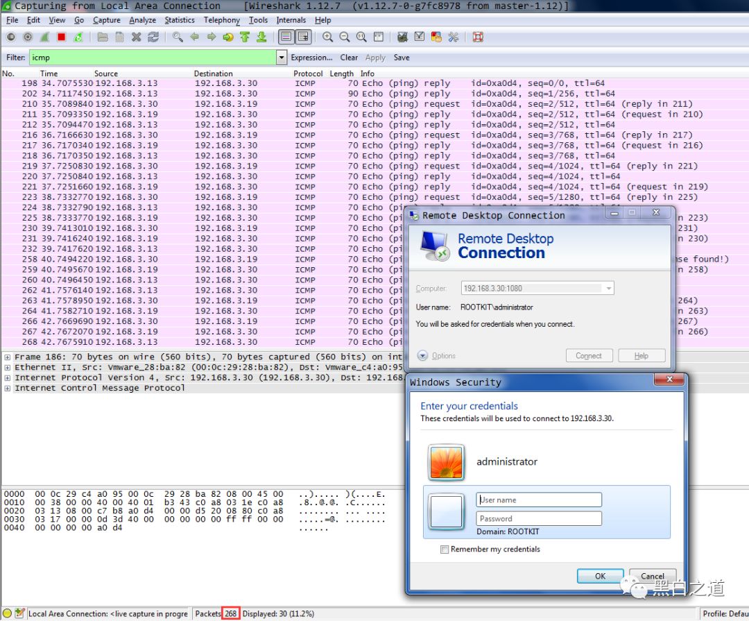 在wireshark下我们很清晰的看到了这一过程,只是这个icmp请求过于密集,很容易触发各种ids