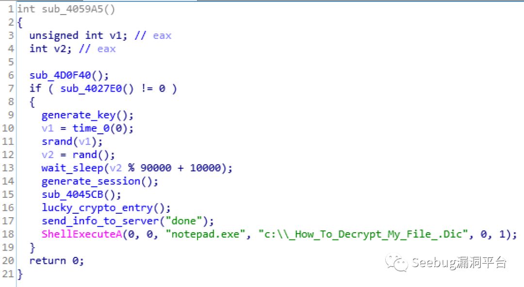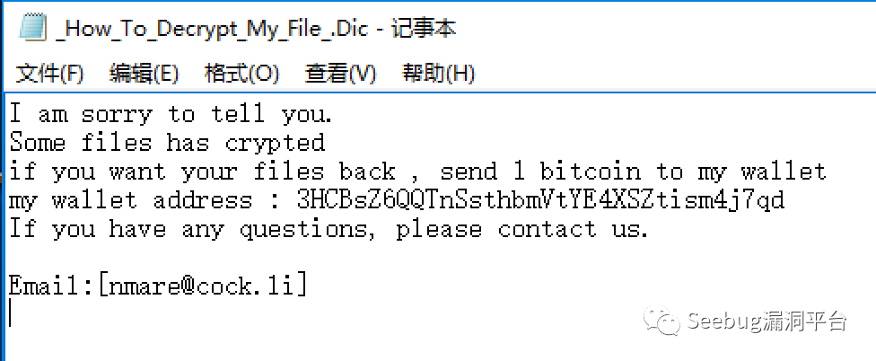 大致的加密流程就是函数标注的如此,最后写入一个文件 c:\\_How_To_Decrypt_My_File_.Dic,通知用户遭到了勒索软件加密,并留下了比特币地址。