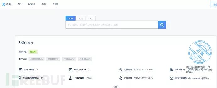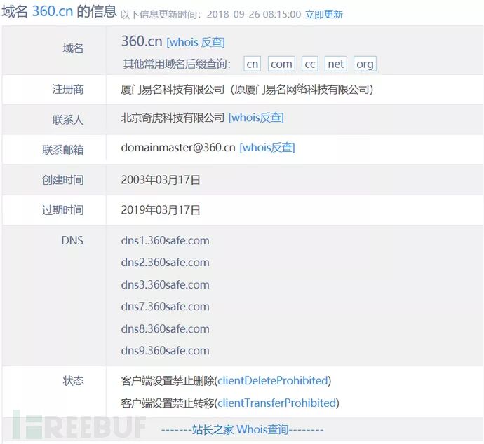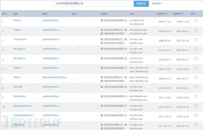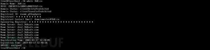 这里我用360.cn为例。可以看到下图我们搜集到了注册商、联系人、联系邮箱等信息。