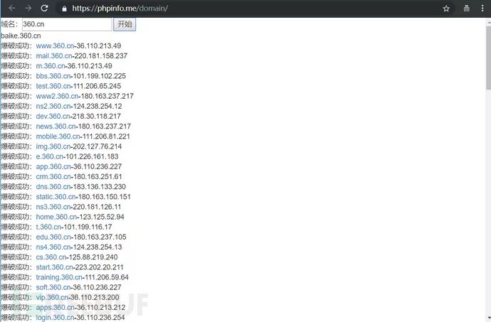 这是Lcy大佬的在线子域名爆破工具,我们可以测试一下爆破360.cn的子域名的效果,如下图所示,作为在线工具,它的爆破速度很可观。