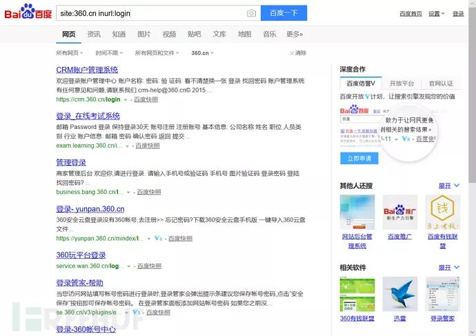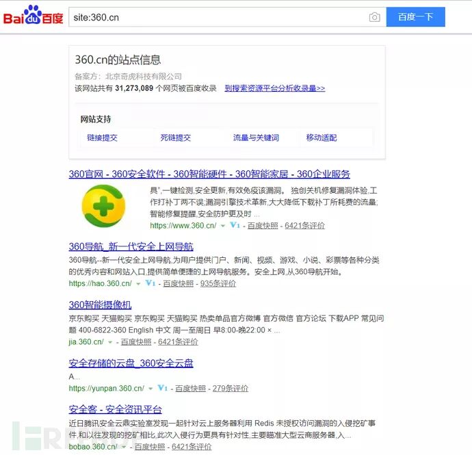 下图是通过百度搜索360.cn子域名的效果图,当然谷歌也是同样的语法。