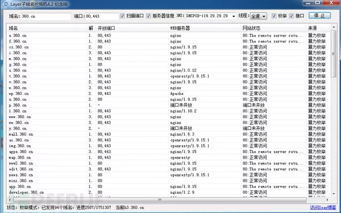 以360.cn为例,爆破的效果如下图,这款软件的好处是还可以进行扫描端口和探测服务器类型