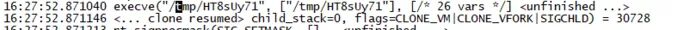 判断是此程序即是主程序,kill掉挖矿进程后,使用strace -T -tt -e strace=full进行跟踪,发现主进程先对挖矿进程增加可执行权限,之后拉起进程。