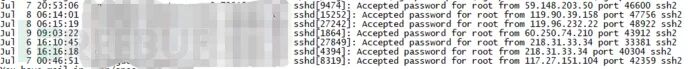上面说了,可能是通过ssh爆破被入侵的,我们先来验证一下。 查看登录日志,发现异常(下图是已经过滤掉正常登录的日志),基本可断定是通过ssh爆破入侵了,也可以断定ssh的访问控制已经失效。 cat /var/log/secure* | grep Accepted
