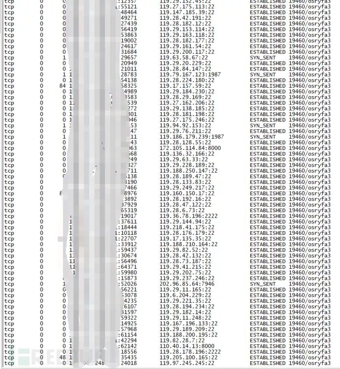 推测一定是有某个主进程在工作,so,继续通过ps和netstat查找监听所监听端口的异常。果不其然,看到异常进程,正在批量爆破,看来是被当做肉鸡了。同时使用lsof查看此进程文件,发现在调用/root/.ddg/4003.db文件,貌似是个加密的社工库。