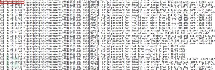 结合以上ip查看爆破日志,确认以上ip的用户不是同一个人,是刚好有这么多ip同时爆破了root账户,而且最短的爆破时间只花了1分钟。想来这个root账户必然是个弱密码了。继续查找Failed日志的最早时间如下: