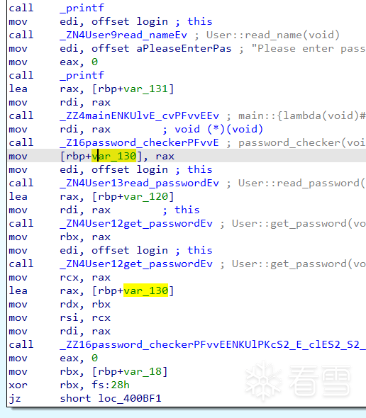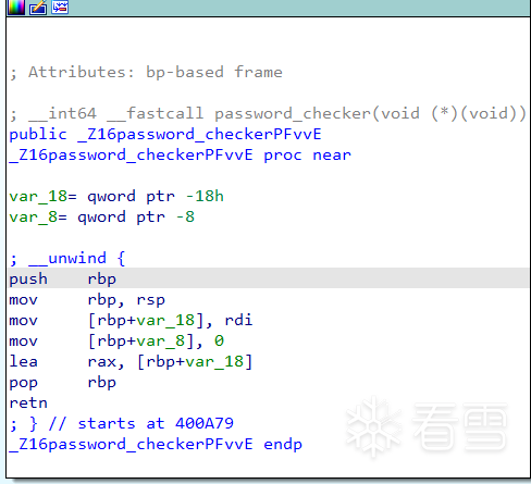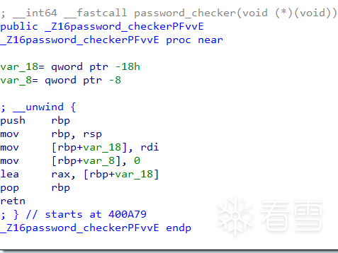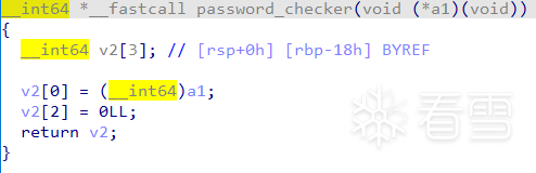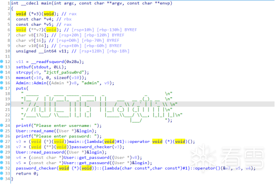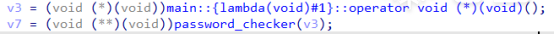 接着到了本题的重点,指针v3(实际只被寄存器暂存)存储函数指针main::{lambda(void)#1}::operator,然后经过password_checker得到二级指针v7。