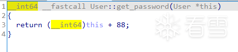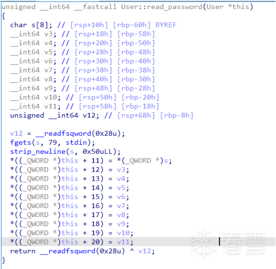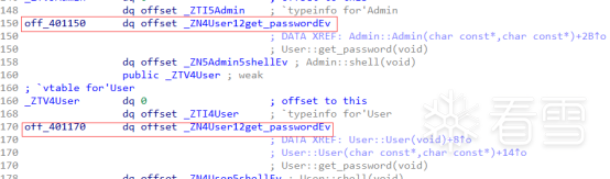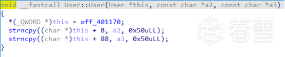 User构建的结构体,包含0x401170处的get_password函数的指针,传入的用户名与密码,它们的上限大小都是0x50。