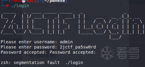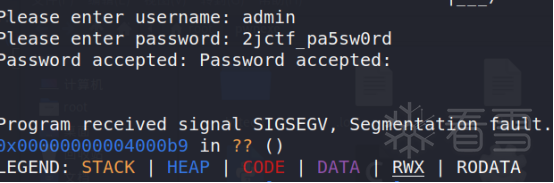在看最后的password_checker()前,我们用正确密码测试文件,显示段错误。