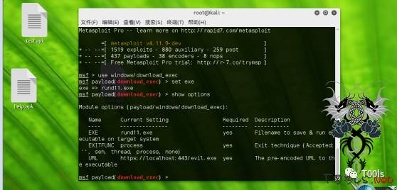 下面我们就开始演示入侵,利用msf生成shellcode,首先打开msf执行use windows/download_exec,show options