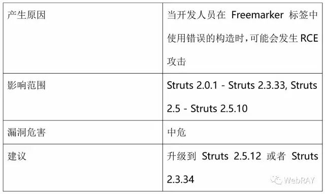 4、修复建议 检查代码并清除易受攻击的构造。升级到Apache Struts版本2.5.13或2.3.34。 并且建议不要在代码中使用这样的结构,或者使用只读属性来初始化value属性(仅限getter属性)。 |