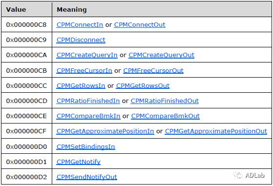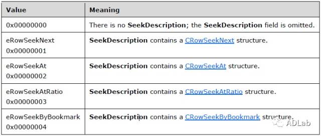struct CPMGetRowsOut { int msg_0; intstatus_4; intulCheckSum_8; intulReserved2_c; intcRowsReturned_10; inteType_14; intchapt_18; //Rows_offset; } 在CPMGetRowsIn消息中,cbRowWidth表示row长度,与CPMSetBindingsIn消息中的cbRow意义相同。cbReadBuffer表示用于存放CPMGetRowsOut消息的buffer大小;cbReserved表示Rows数据在CPMGetRowsOut消息中的偏移;eType表示查询的方法,取值范围如下表所示。