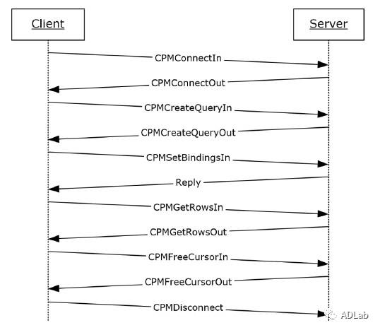 当客户端对远程主机发起搜索请求后,它们之间使用Windows搜索协议(Windows Search Protocol,WSP)进行数据交互。交互的消息序列如下所示。其中,CPMConnectIn 消息中包括服务器的名称和索引名称(默认Windows\SYSTEMINDEX)。服务器验证客户端的权限后建立会话,回复CPMConnectOut消息; CPMCreateQueryIn消息用于设置查询的文件目录范围、关键字信息等; CMPSetBindingsIn消息用于设置返回的查询结果内容,例如文件名称、文件类型等;CPMGetRowsIn消息用于请求查询结果。
